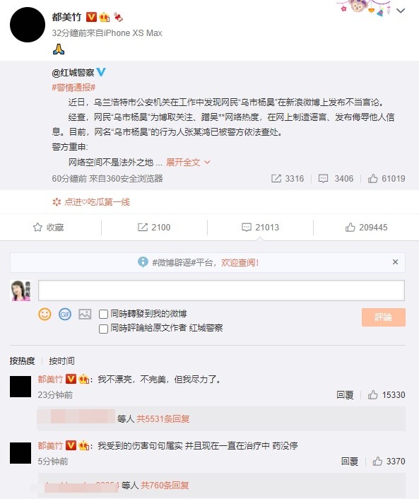 警方通报调查事件始末后,都美竹沉默多日首度更新贴文,转发红城警察关于网友造谣的通报,并在留言串写下我不漂亮,不完美,但我尽力了,同时提到现在的状态,我受到的伤害句句属实,并且现在一直在治疗中,药没停。