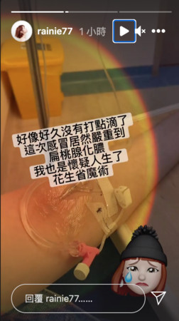杨丞琳今突然在IG上PO出自己送急诊,在医院吊点滴的照片,并写:好像好久没有打点滴了,这次感冒居然严重到扁桃腺化脓,我也是怀疑人生了,花生省魔术。她下午现身上海机场时,还穿着萤光色短版小可爱外搭牛仔外套和长裤,当时看起来就有点疲累,没想到后来还送医,让粉丝都心疼不已,她则PO出机场美照自亏:急诊前的英姿。