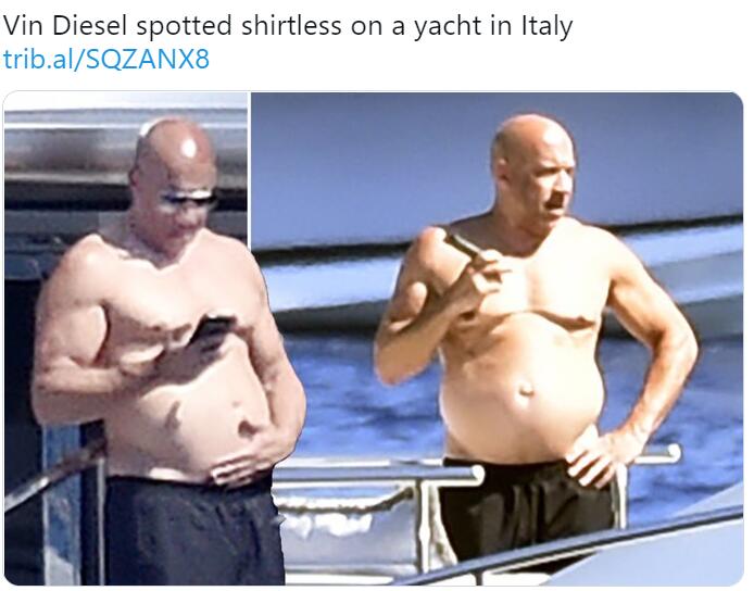 最近美国狗仔在直击冯迪索私下的真实状态,画面让许多人都吓呆!八卦网站《Page Six》报导,唐老大日前与模特儿女友芭洛玛·洁曼兹(Paloma Jiménez)前往义大利小岛菲诺港(Portofino)度假,搭乘私人游艇享受悠闲时刻。当天冯迪索穿上一件黑色短裤、戴上太阳眼镜,顶着一颗招牌光头现身,只见原本精壮的六块肌竟变成一团肥油,大片胸肌也不见,期间他还将手放在圆滚滚的肚子上,崩坏的模样全被狗仔捕捉下来!