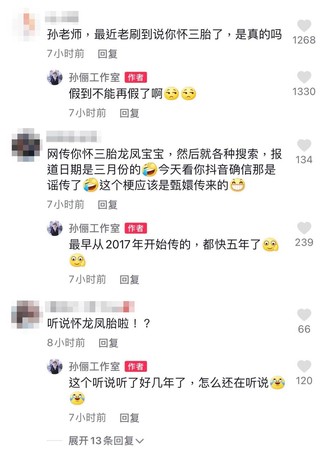 对此,孙俪工作室面对网友大量洗版第三胎是龙凤胎的传闻,也以逗趣的口问直接回应谣言,不仅正面澄清消息假到不能再假,还自嘲传闻早在2017年就开始谣传都快5年了,还有不少民众留言听说怀龙凤胎啦?工作室则高EQ吐槽这个听说听了好几年了,怎么还在听说,并附上好几个笑哭的表情符号表达无奈。