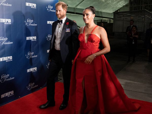 英国哈利王子与老婆梅根(Meghan Markle)卸下英国王室资深成员义务后,奔向美国洛杉矶寻求新生活后,一举一动依然深受瞩目。两人日前受邀到纽约参加向老兵致敬的向自由致敬晚宴,再度成为全场焦点,尤其是梅根一袭大红色的低胸又开岔的礼服,气势十足,难得被网友大赞美极了。