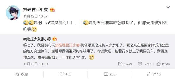 更令网友爆笑的是,江小宴随后也转发这篇PO文,证实搭便车这件事情是真的,还加码爆料夏之光的热情行径:帅哥没白蹭车,吃饭喊我了,但那天哥确实刚吃完。透露夏之光不仅上了狗仔的车,本来还打算请客邀对方一起去吃饭,完全颠覆一般偶像发现被偷拍之后的反应!