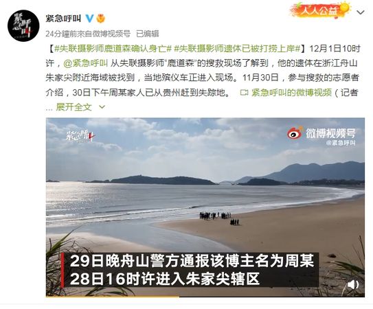 25岁大陆网红摄影师鹿道森(本名:周鹏)于11月28日在微博疑似发表遗书,称是最后一次介绍自己,随后失联,朋友为此立即报警。他失联多日,手机定位曾在浙江舟山市的情人岛,12月1日早上10点多,传出摄影师确定身亡,遗体已经被打捞上岸。
