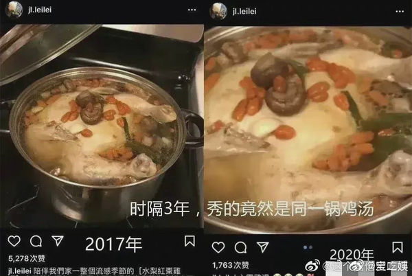 该网友抓包,李靓蕾为了替王力宏营造美满家庭的形象费尽苦心,2017年在IG上传一张爱心鸡汤照,3年后又PO了同样一锅鸡汤,只是照片刻意拉近,但还是被眼尖网友发现这是旧照重用,笑亏:一锅鸡汤烧3年。另外也发现王力宏每次公开和老婆出席活动放闪时,眼睛都会直直盯着镜头,被指是刻意晒恩爱。