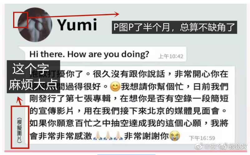 隔没多久,Yumi的闺蜜做个小孩007也再度跳出来反击,他表示台媒做的模拟对话内容看似是在替Yumi洗白,实际上再度把裸女头贴放上去是在荡妇羞辱,并质疑裸女头贴与先前李靓蕾所提供的不同,有造假嫌疑!而闺蜜做个小孩007又再度暗讽李靓蕾花钱买网军,企图控制舆论方向一事。
