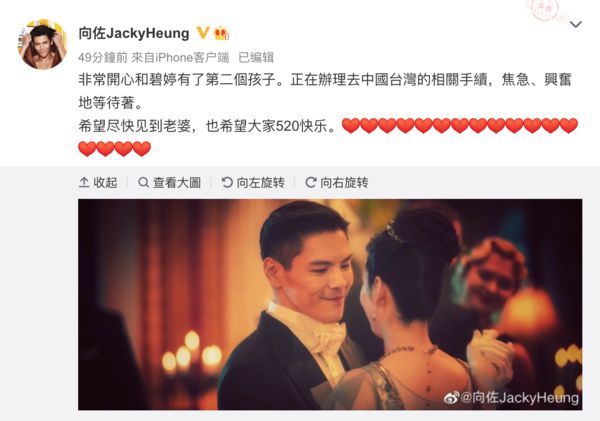 女星郭碧婷正式官宣生二胎!香港星二代老公向佐选在520官宣非常开心和碧婷有了第二个孩子,同时透露正在办理来中国台湾的相关手续。妈妈向太陈岚19日已经透露郭碧婷怀二胎一事,预产期下个月。