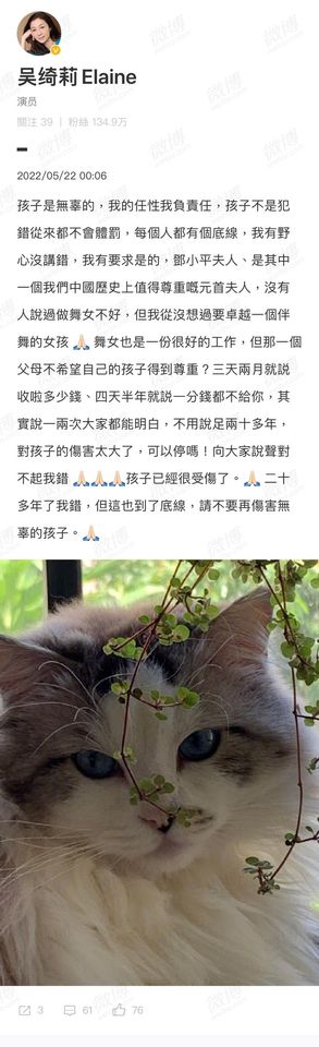 接着吴绮莉向大家道歉,并说孩子已经很受伤了。二十多年了我错,但这也到了底线,请不要再伤害无辜的孩子。由于她的文字表达有些不清楚,也引发喝醉发文的揣测,此外,她在留言串写下:希望某巨星再有任何宣传,不要再用贬低我和孩子来做宣传,对孩子的伤害太大了。网友劝沉默是金,她再回我的沉默令我孩子受了太大的伤害、已经到我的底线,疑似已经忍受不了情绪爆发。
