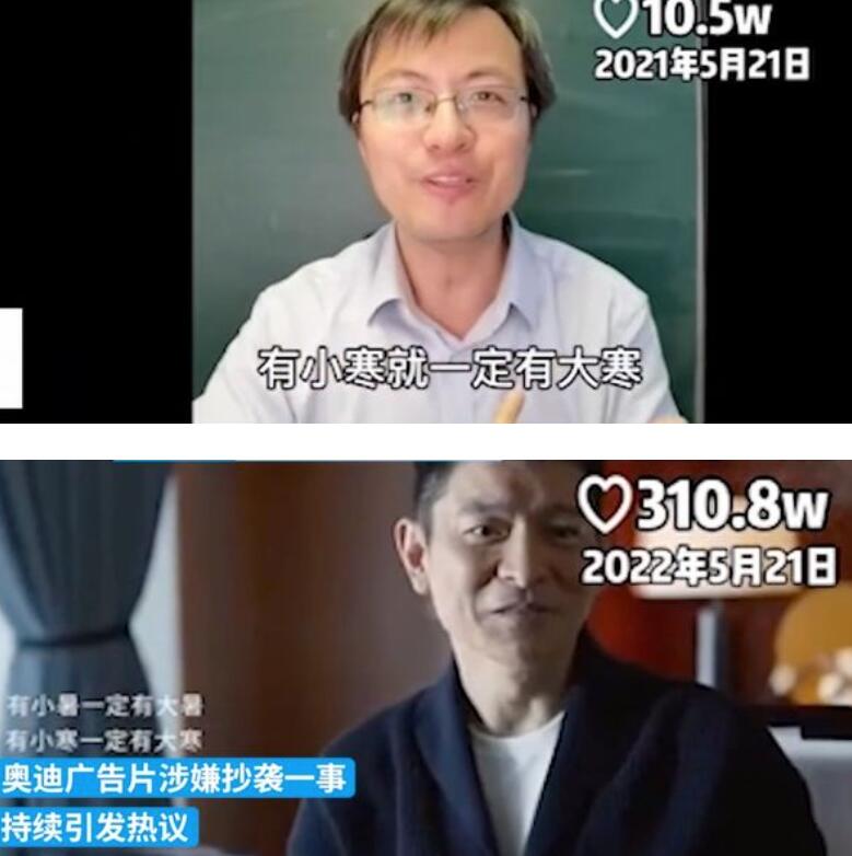 一汽奥迪车商昨21日发布一则以小满节气为主题的广告片,长达2分10秒内容由天王刘德华代言,立刻引起关注。结果,一名抖音网友北大满哥跳出来指控,奥迪商业广告文案完全抄袭他去年5月21日为小满录制的一段视频,导致很多不明情况的网友留言骂他盗用。