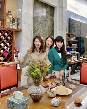 据衍生集团创办人的妻子彭关丽雯(Carman)日前晒出3人合照,陈少霞身穿绿色长袖上衣搭配百折花裙,和闺蜜共同举杯合照。她和好友一起在花园喝茶,手上戴着翡翠戒指相当贵气,豪宅内留下美丽倩影,散发优雅气质。