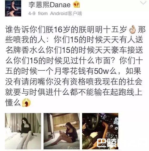 回顾一下,她一直觉得自己整得漂亮有自信,还有好几次在公开场合直接开呛。像是在微博发文,她就直接说:谁告诉你们朕16岁的,朕明明15岁,那些喷我的人:你们15的时候天天有人送名牌香水吗?你们15的时候天天豪车接送吗?你们15的时候见过什么世面?如果没有请闭嘴,你没有资格喷我,现在的社会什么都不能输在起跑线上,懂吗?