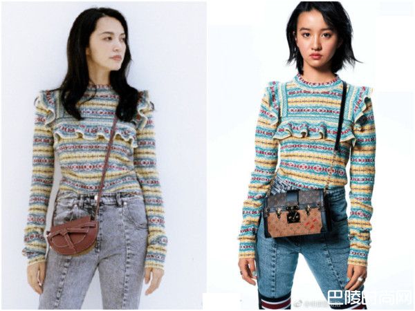 LV这件针织上衣来自2018早秋系列,颇为典雅并带有民俗味,单穿就非常有特色,LV让模特儿把上衣放出来,系上腰带,姚晨和Koki则选择塞进裤子,两种穿法都有型。Koki斜背着灵感来自缩小版行李箱的Trunk包,显得俏丽,姚晨的肩上则是LOEWE迷你款Gate包,带有着率性。