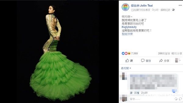 天后Jolin蔡依林即将推出睽违4年的大碟《Ugly Beauty》,相较过去要求一丝不苟的完美造型,这次她大走搞怪风格,大胆挑战各种前卫服装,25日曝光最新宣传照,只见她穿着一袭合身人鱼装,凸显前凸后翘的火辣身材,整个背部挖空直至股沟上方,下半身则是绿色蓬蓬裙摆,乍看之下像极了圣诞树,还有网友笑亏:好像毛刷!引起热烈讨论。