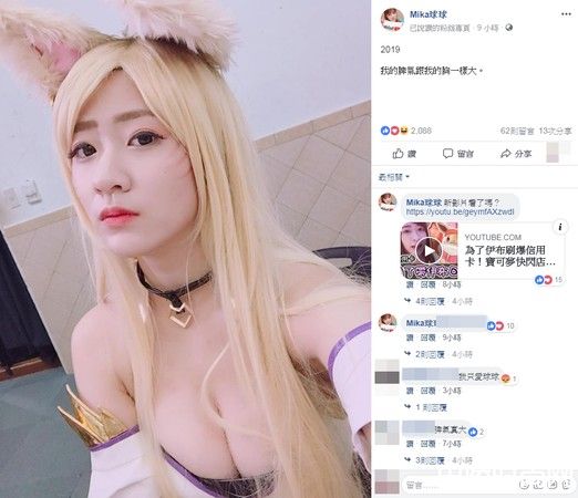 网红球球外型甜美,曾和Jasper星培交往约2年,双方前阵子宣布分手后,她日前也开始努力经营YouTube频道,掳获不少粉丝的心。她透过社群网站分享生活、工作点滴,近来Cosplay游戏《英雄联盟》(League of Legends,简称LoL)中的角色阿离,意外展现出傲人胸围,让不少网友惊叹连连,引发讨论。