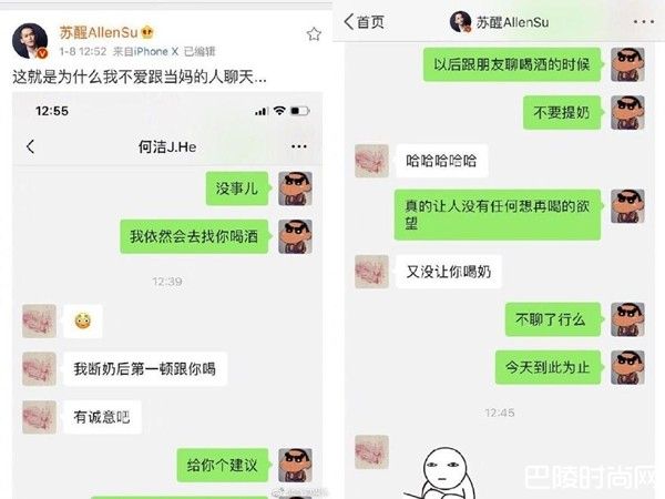 苏醒8日突然发文,晒出私底下与何洁的对话记录,附文写道:这就是为什么我不爱跟当妈的人聊天…。然而引人注意的是,当苏醒回说,没事儿,我依然会去找你喝酒。何洁竟回,我断奶后第一顿跟你喝,有诚意吧。虽然事后苏醒秒删PO文,但仍被眼尖网友截图疯传,一番言论曝光,立刻引发外界揣测。