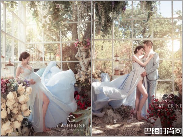 刘伊心请到凯萨琳婚纱摄影订制个人礼服。她第一套礼服结合代表自家老虎牙子的浅蓝色,加上雪纺材质,整个人像蓝色云朵般的柔软飘逸,代表自己追求的有氧精神。另外一套礼服则是贴身鱼尾,不仅能显露圆滚的肚子,质地选择细致的裸肤法国蕾丝,也充满女人味。