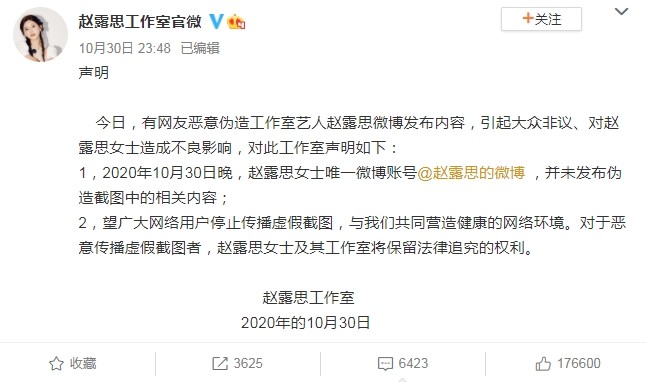 没想到,近来陆网疯传一张截图,画面中疑似是赵露思透过微博帐号发文写下喜欢你3个字、还直接Tag肖战的帐号,甚至传出PO文后秒删的传闻,掀起外界热议。不过,针对此事,女方工作室昨晚火速发出声明辟谣,强调截图是假的,2020年10月30日晚,赵露思女士唯一微博帐号『赵露思的微博』,并未发布伪造截图中的相关内容。