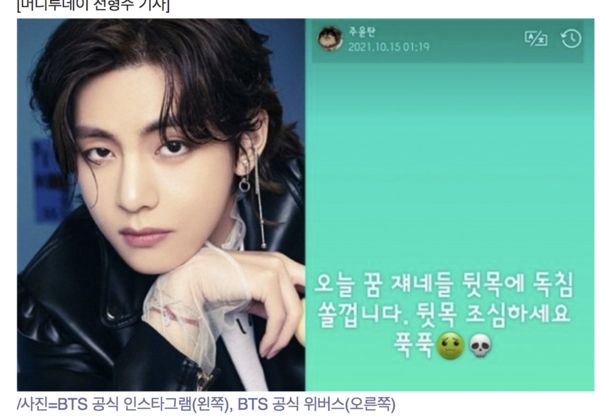 公司澄清事实后,V似乎受到不小影响,15日便被韩媒爆出,他在防弹的专属粉丝平台表达心声,先是深夜PO出很心寒,想要唱《UGH!》,歌曲《UGH!》是防弹发行的歌曲,歌词写到真实成了谎言,谎言成了真实、我很生气愤怒等,后来又紧接着PO文两则文表示今晚会在梦里射他们后颈毒针,小心脖子后面,字句间都能感受到他的无奈及忿恨。