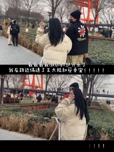 网友小愿发布2日VLOG开心表示偶遇王大陆和蔡卓宜,影片中可见他们除了基本防疫戴口罩外都没有刻意遮掩,大街上满是人也沉浸在小俩口的世界里。网友进而透露是在上海西岸艺术中心巧遇到的:他们应该是去江边骑车,一人推着一辆车,说说笑笑看狗狗,王大陆还很耐心给蔡蔡拍了好久的照片,今天又是羡慕爱情的一天。