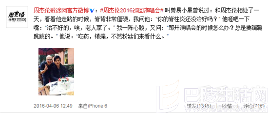 前几日网络上曝出了一段叫兽易小星和周杰伦的对话,当被问到脊柱炎没治好接下来的演唱会怎么办时,周杰伦却回答:""吃药,镇痛,不然粉丝来看什么。""其实我相信即便周天王站在台上静静唱歌都能带给粉丝一场完美的演出。