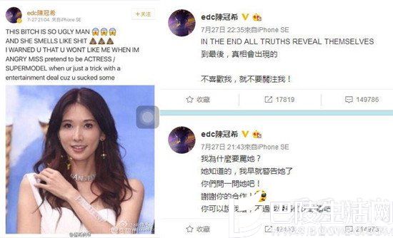 陈冠希7月27日晚突然通过微博用英文爆出大段粗口,并配上一张林志玲的图片,直斥“BITCH”,看似没有瓜葛的两人突然引来一片哗然。