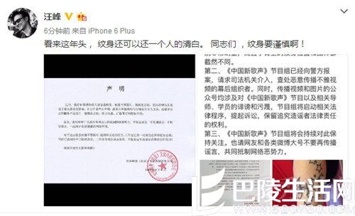 对此汪峰老师本人更是耐人寻味地发博以证自己学员的清白:“这年头,纹身还可以还一个人的清白。”可以看出他深深的无奈感,也进一步指明了事情的真相。