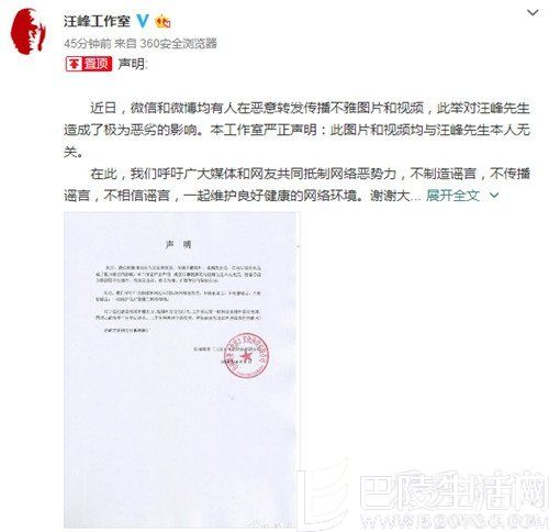 声明正文:“近日,微信和微博均有人在恶意转发传播不雅图片和视频,此举对汪峰先生造成了极为恶劣的影响。本工作室严正声明:此图片和视频均与汪峰先生本人无关。在此,我呼吁广大媒体和网友共同抵制网络恶势力,不制造谣言,不传播谣言,不相信谣言,一起维护良好健康的网络环境。谢谢大家的支持和理解。