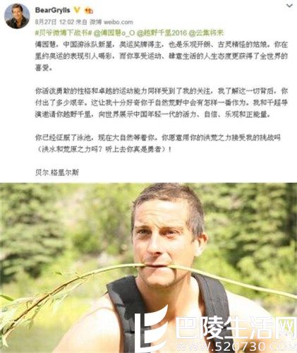 傅园慧在参加里约奥运会的时候就因为自己直率可爱的性格迅速的俘获了一大帮的网友们的喜爱,在奥运会结束之后傅园慧的人气也是丝毫不减,在奥运代表团去到香港的时候,傅园慧也是受到了很多的香港市民们的喜爱,让傅园慧真正被大家喜欢的原因就是那一段堪称泳坛泥石流的采访视频,傅园慧在接受采访之后也是获得了一个新的外号,叫做“洪荒少女”,在近日,英国著名的野外探险大师,主持英国著名的《荒野求生》的贝尔,通过个人的社交网络平台向大家喜欢的洪荒少女傅园慧发出了挑战书,想要邀请傅园慧参加自己的中国大陆主持带队的新节目,挑战大自然。据悉,贝尔已经确认将参加录制自然探索的一档真人秀节目《越野千里》,现在正在邀请其他成员。
