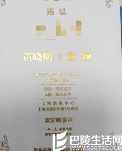 2015年5月27日,黄晓明和杨颖在青岛民政局领证。两人的大婚地点定在上海展览中心。之所以定在这里而不是什么五星级酒店,原因很简单:这次黄晓明要请的嘉宾实在太多了。9月25日,有网友晒出黄晓明和Angelababy婚礼的请帖,封面是一扇铁门,上面写着“ah”,里面以两人相拥的剪影为背景。虽然新人方面始终没有放出官方消息,确认这次婚宴的嘉宾出席名单,但是网上关于哪些大腕要来还是陆续有传闻。比如,伴郎是李云迪和王思聪,伴娘是李冰冰。婚宴总共有200桌,因此宾客将达到2000人。大牌明星中,赵薇和李冰冰、范冰冰都会到场,“双冰”还专程为此调整了自己的工作时间。正在波兰出任肖邦钢琴比赛评委的李云迪前晚连夜飞到上海,甚至不得不在飞机上孤独过生日,为的就是赶来参加黄晓明的婚礼。就连之前传闻说跟黄晓明关系尴尬的陈坤,也因当天在国外工作而专程录了祝福VCR送来。至于婚礼环节,17:30嘉宾入席,19:00正式婚礼。除了当晚的盛大宴席之外,应该还有助兴节目。据说赵薇将带着她和黄晓明共同的北电老同学一道献上惊喜。
