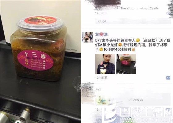 9月13日,高晓松在微博写道:“为熬过未来十几小时飞行,不远十里背了一大罐十三香小龙虾。刚登机,把罐子交给空姐说:这个给你们(‘待会帮我加热一下’没来及说出口),被空姐清脆地一句:‘您太客气了!’然后转头对小伙伴说:‘先生太客气了还给咱们带吃的!一会儿给机长也送点。’我欲哭无泪,强颜欢笑。紧抱住我的小罐话梅。”随后高晓松还哭诉道:“呜呜呜我过完安检登机前在登机口旁的小店刚买的一大罐!往常这家有醉蟹,这回没了,就买了小龙虾。早知道自己焐热呀,没想到最后只剩下……”根据高晓松所说的内容,可以想象出当时的场景,也可以想象出小龙虾被拿走时,高晓松哭笑不得的表情,很多网友都纷纷心疼高晓松:“心疼大紧一秒钟”,“哈哈哈听起来就想要流泪”。