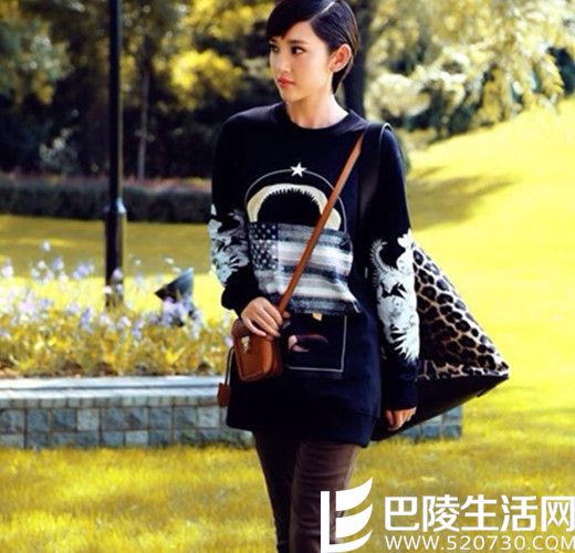 在介绍完以上两种“唐艺昕式”卫衣穿搭法后,小编要继续为妹子们谋福利,由于有些妹子的腿型不够完美,臀部也不够翘,那么,接下来小编就要为大家介绍长款式的卫衣了,该款卫衣的长度如上图所示在臀部一下大腿以上的部位即可。下身的话可以像唐艺昕一样选择不那么贴身的裤子款型,但是注意褶皱不要太多哦,一定要努力将视线重点往上半身挪放。