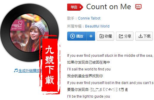 《Count on Me》是英国歌手康妮·塔波特(Connie Talbot)演唱的一首歌曲 。歌曲隶属于专辑《Beautiful World》。
