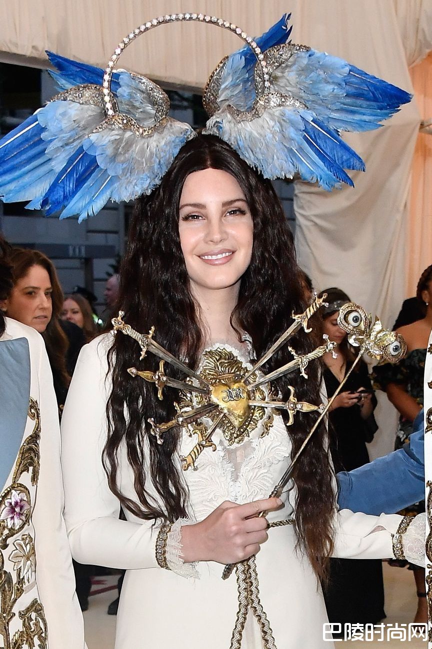 与Lily Collins同样向七苦圣母致敬的拉娜德芮,将深棕色长发中分并辅以高层次波浪造型,搭配简约无瑕妆容,典雅庄重。精致蓝色羽毛头饰增添造型的宗教氛围,与Gucci 设计总监Alessandro Michele、歌手Jared Leto杰瑞德雷托三人扮演耶稣组合现身红毯,100%贴切主题也获得一致好评。