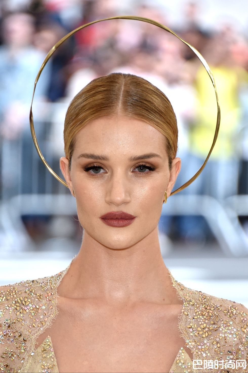 因《变形金刚3》受到国际瞩目的超模Rosie Huntington,今年在红毯上以中分贴发、金色光环头饰搭配简单的干燥玫瑰色唇彩、大地色眼影优雅亮相,向拉斐尔的着名画作《草地上的圣母 Modonna in the Meadow》致敬。