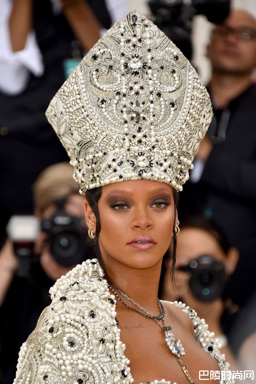 天后不管到哪里都是天后!总是超认真对待每一件事的她再度获得Met Gala最认真穿搭奖,以及最美女教宗称号。超淡眉色与浓烈的烟熏眼影隐约形成神秘的双眉。颧骨下方的修容与T字脸颊的打亮让蕾哈娜的脸更加立体,从中央以白色打亮渐层到两边紫粉色的唇妆画法也为妆容加分许多。