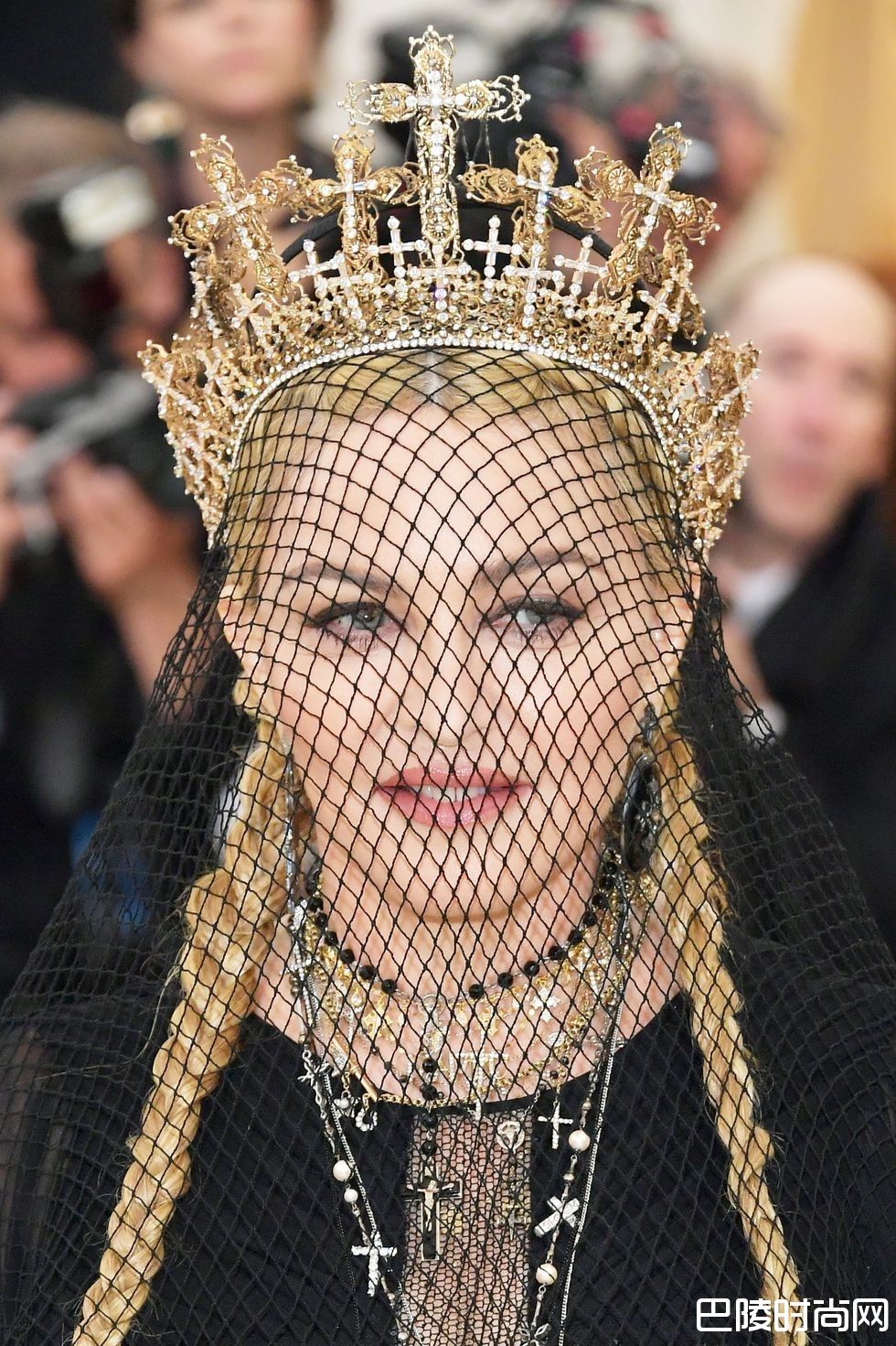 头顶着超华丽十字架皇冠、罩上黑色网状面纱,玛丹娜将金黄色头发编成鱼骨辫,并画上粉嫩色唇彩,在暗黑哥德式服装下露出若隐若现的甜美妆容。在红毯现场出现多张低姿态跪姿的照片,玛丹娜在Instagram上表示:今天的我是服侍者。
