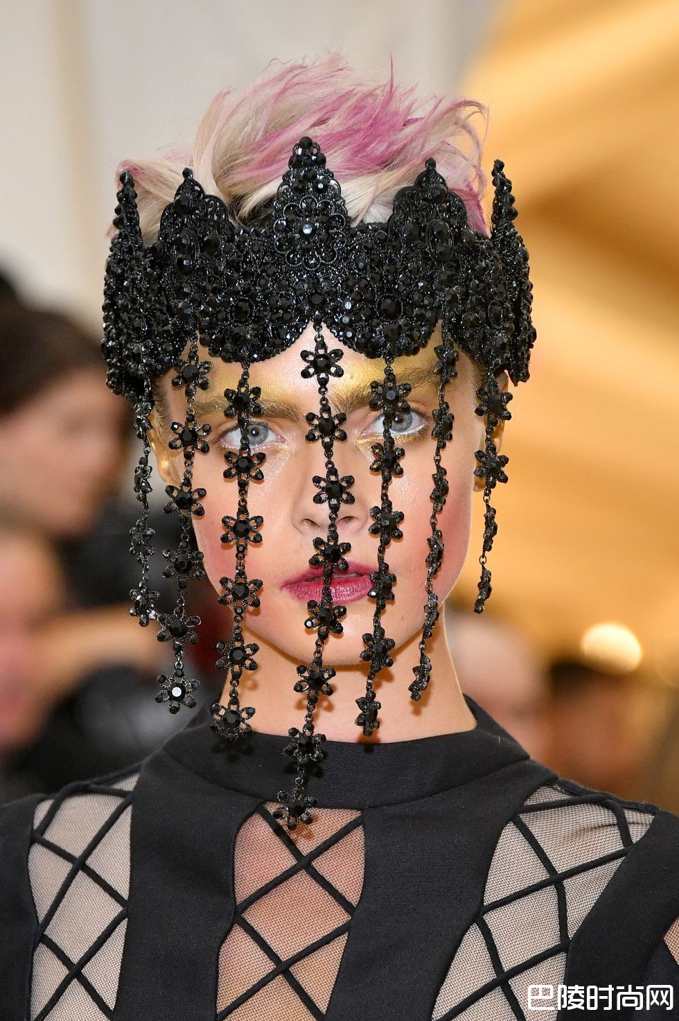 同样以黑色礼服、面纱营造神秘气息的Cara Delevingne,在严肃的黑色头饰下将超夸张的金色眼影大量刷在眉毛、眼周,再搭配超粉嫩颊彩、显眼桃红唇色及挑染的粉色短发,叛逆个性依旧藏不住。个性大胆又前卫的她,其实有个超优雅的名媛姊姊Poppy Delevingne芭碧迪乐芬妮,而姐妹花两人一直是时尚界IT Girls!