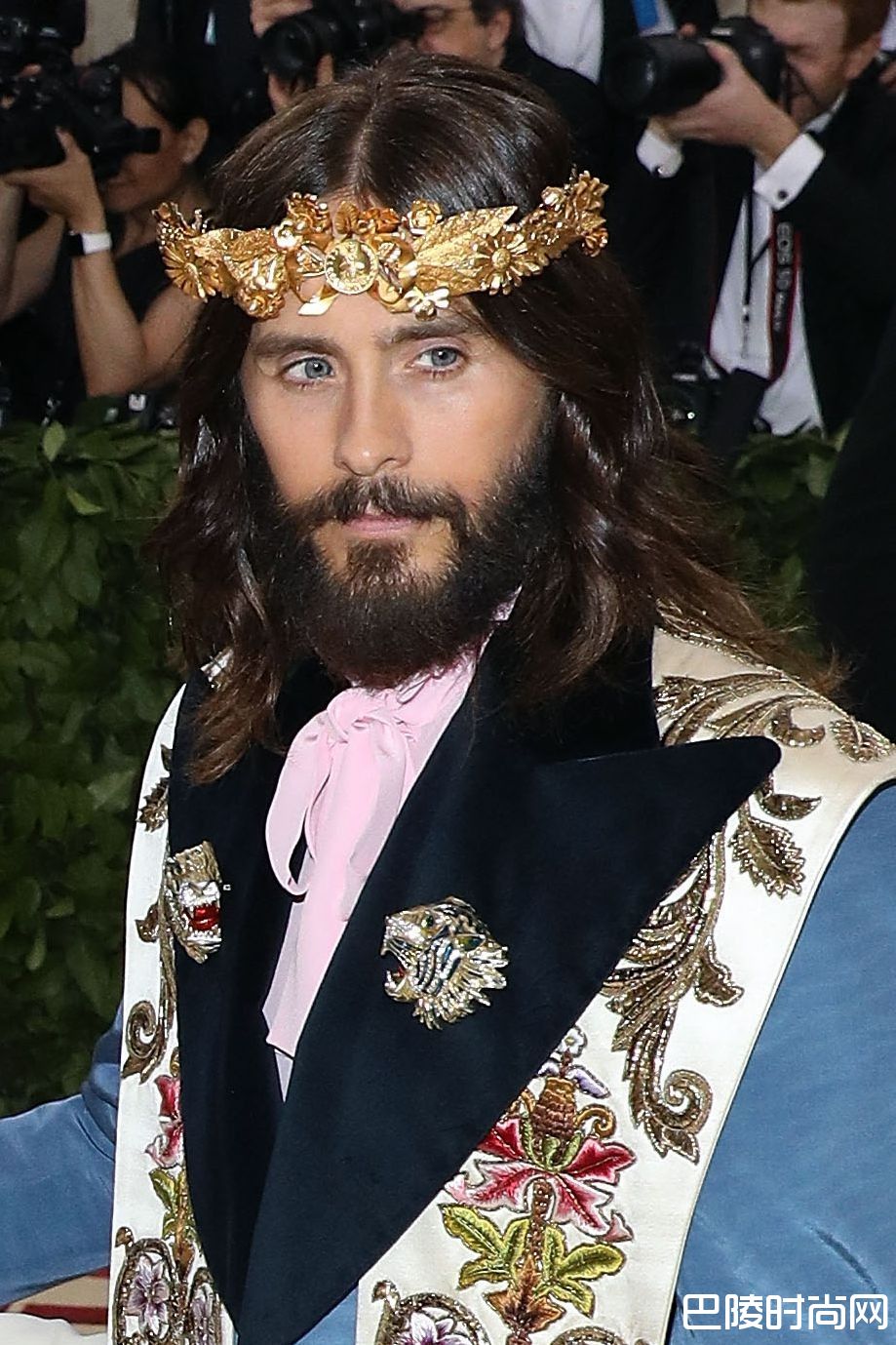 话题性完全不输众女星的Jared Leto头戴荆棘造型发饰,留着超经典的微卷中长发并蓄胡,在一身Gucci的极繁美学下,完美消化耶稣造型,让众人眼睛一亮。