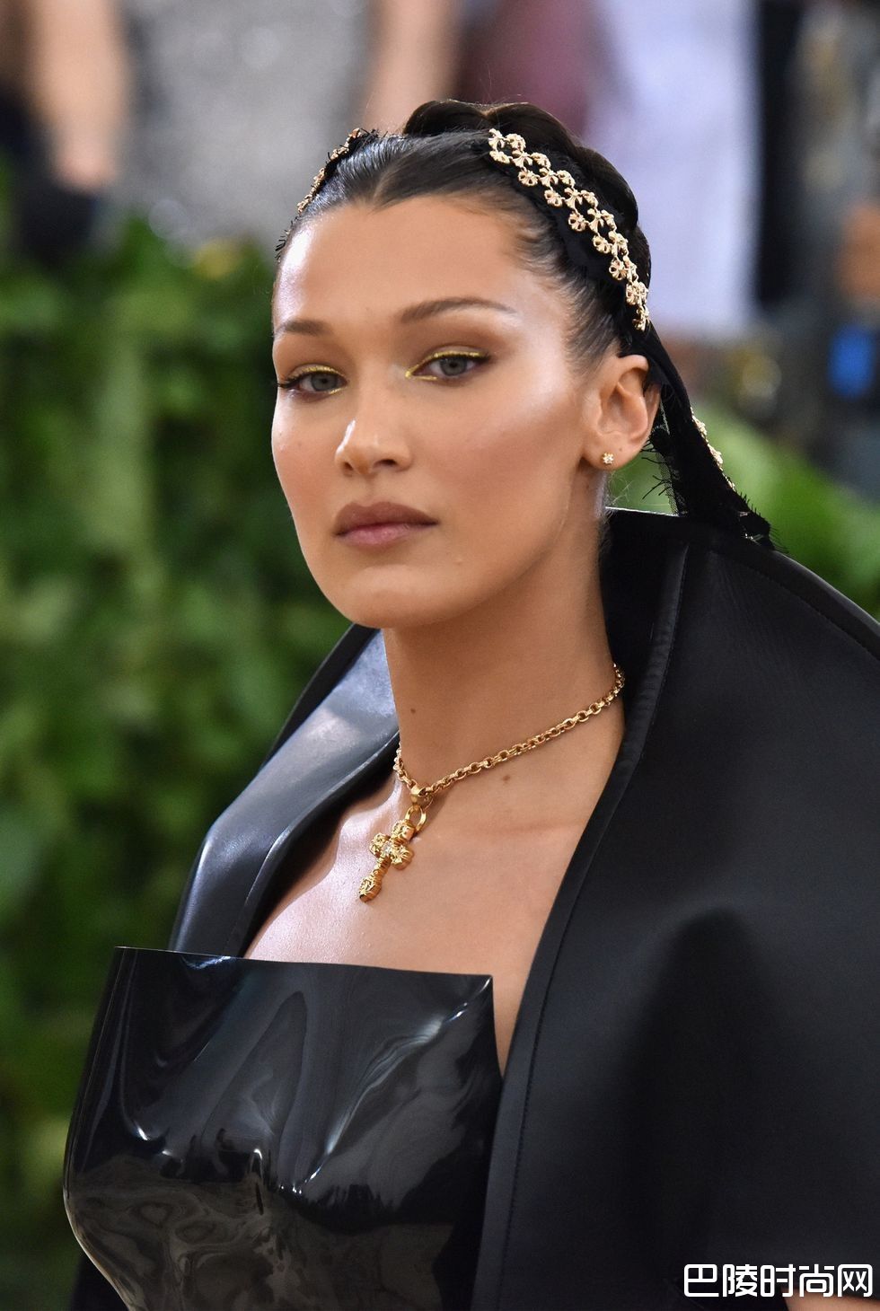 同样大大利用黑色元素的时尚界新宠儿Bella Hadid化身厌世女巫,细细的平眉下是浅金色眼线及接近裸唇的唇色。将全黑色头发中分后梳成辫子再缠成发髻,发际两侧别上立体印花造型的发夹,在全黑造型上增添一道亮点。