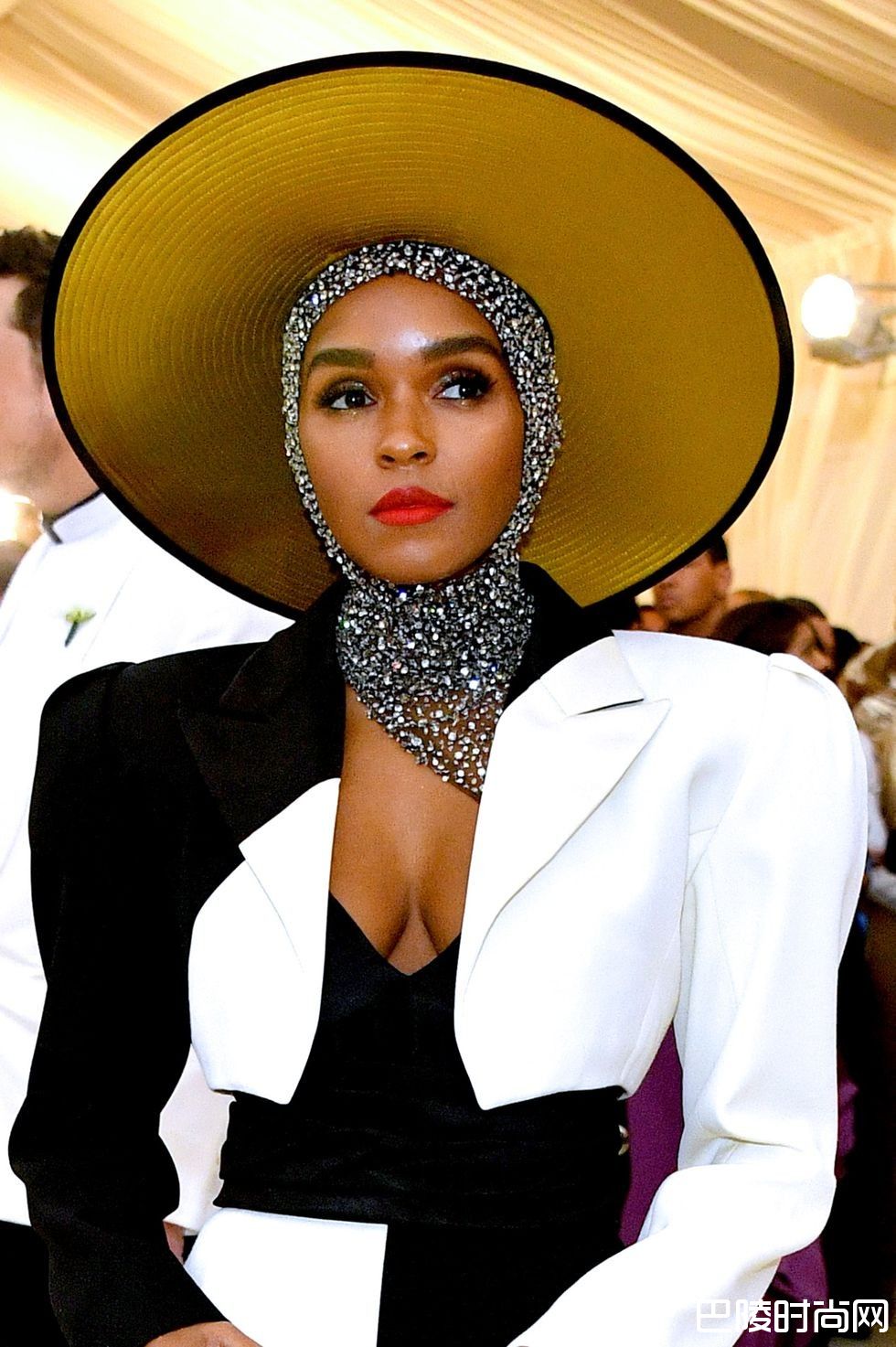 灵魂歌手Janelle Monáe在不规则黑白礼服上搭配具有超宽金色帽沿的复古礼帽,与超闪头巾互相辉映;精致小脸上画有黑色浓眉与大红唇,融合着复古及摩登气息的整体造型亦展现她的独特时尚品味。