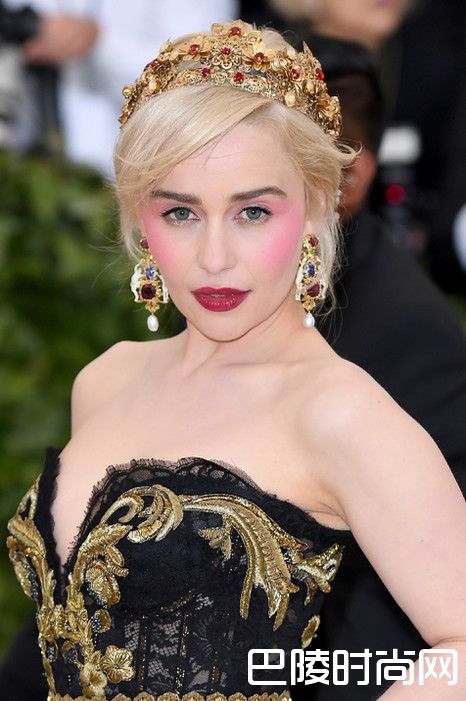 在《冰与火之歌:权力游戏》中,以一头银白色长发及美丽容颜迷倒众生的龙后Emilia Clarke,这次将银白长发盘起,戴上红宝石皇冠,与红润的唇互相呼应。大胆的用色展现于腮红及眼影上——白皙的皮肤上画着亮粉色的眼、颊彩连成一片超吸睛。