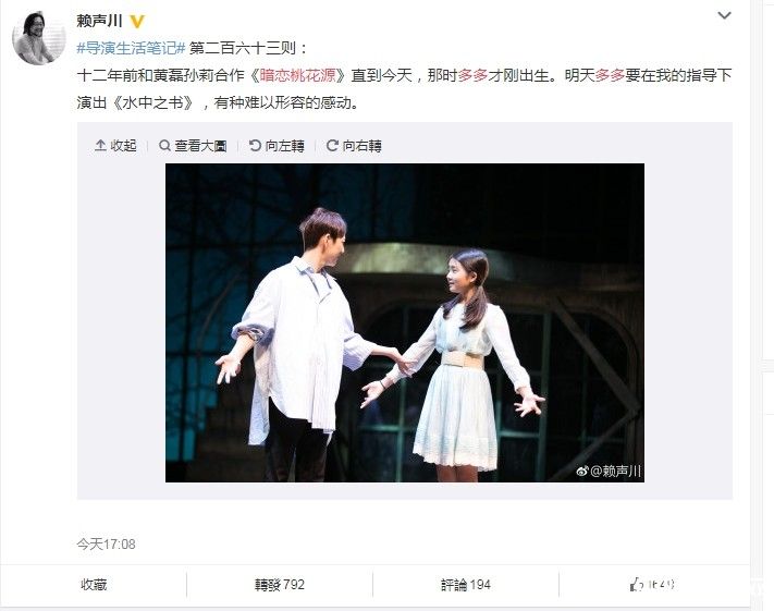 多多20日要演出赖声川导演作品《水中之书》,其实她和舞台剧渊源,早在2岁就已经开始,当时爸妈演出赖导的《暗恋桃花源》,当时还跟着巡演,妈妈发文回忆:她几乎会背每一个人的台词,也熟悉舞台的每一个角落,她一直有一个梦想,就是能够成为一名舞台剧演员,这一次梦想成真,明天晚上我的小多多将第一次走上戏剧舞台,我亲爱的女儿,妈妈为你骄傲!。