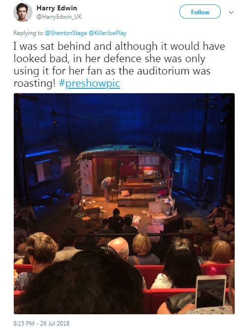 舞台剧演员哈里艾温(Harry Edwin)称,自己当时就坐在该名拿iPad的观众后方,他帮忙解释,当天的剧场室内有点闷热,她其实只是为了吹小型电风扇才拿出iPad。不过因为剧场内除了舞台上有灯光以外,观众席是非常暗的,因此他表示:不过从舞台上看下来,却是会让人有不太好的观感。哈里艾温晒出偷拍该名观众的画面,只见该女士的平板电脑上有个小电风扇,而萤幕确实是暗的。