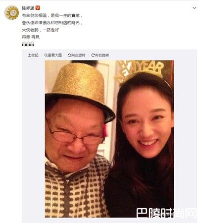经过一夜的沉淀,陈乔恩终于对外出声,31日下午透过微博发文,PO出与金庸的合影,沉痛写下告别:有幸与您相识,是我一生的宝藏,会永远珍惜怀念和您相处的时光,大侠老师,一路走好,再见,再见。