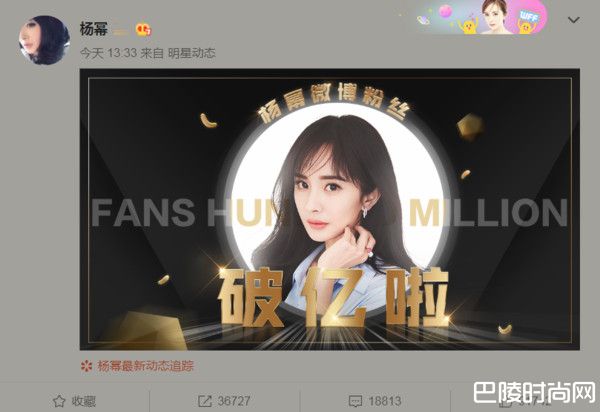 后来,2014年播出《古剑奇谭》、《分手大师》等暑假热剧,杨幂粉丝再攀升一千万到四千万数;2015年及2016年分别拍摄《翻译官》及《三生三世十里桃花》,粉丝数飙到七千万;今年8月扶摇播完后,杨幂粉丝数来到九千万;最后,杨幂在今天下午1点33分达成1亿粉丝成就。