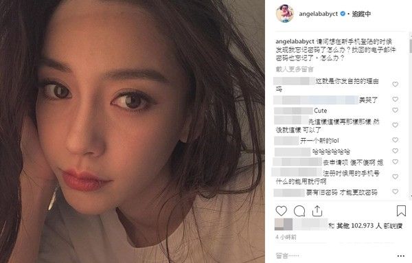 女星Angelababy在IG发文求救,透露用新手机登录的时候,发现已经忘记密码,连找回来的电子邮件密码也忘记了。求救讯息吸引众多高手留言协助,也有人笑亏一孕傻三年啊!