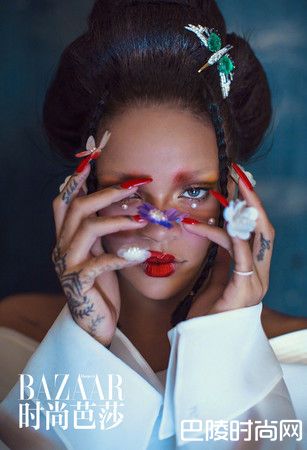 蕾哈娜近来为《时尚芭莎》拍摄封面,与大陆知名摄影师陈漫合作,拍摄一系列中国风大片。她穿上唐朝风的服饰并拿起团扇,并妆点上代表性的高髻、金色眼影、樱桃嘴和花钿,创造出古今融合的造型。