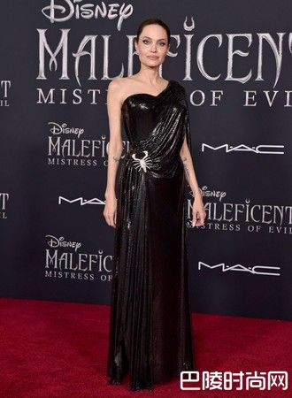 在美国首映会上,朱莉身穿爱牌Versace 的黑色亮片斜肩礼服,腰部用了一只水钻蝎子做装饰,突显她在片中的反派性格,整个人美艳又优雅,简直就是黑魔女化身!