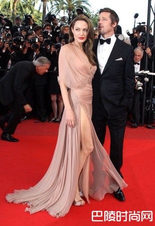 再一次朱莉穿上她的爱牌,Atelier Versace 所设计的两件式礼服,上身是马甲式水钻,下身则是黑色绒布裙摆,材质的冲突感让她显得更迷人优雅。