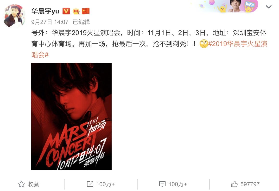 华晨宇在9月时宣布演唱会将加场演出,当时华晨宇发文表示:再加一场,抢最后一次,抢不到剃秃!,而到了抢票当天(10/12)中午华晨宇突然发文写下:我....睡过头了...,并附上很委屈的表情符号,令许多粉丝哭笑不得。然而在26号时华晨宇也发出一张黑白的自拍照,画面中他的发型变成了光头,饱满的额头一览无遗,粉丝们也都相当敬佩他的勇气,纷纷留言说道:真男人、 言出必行,绝了、胡子比头发长了。