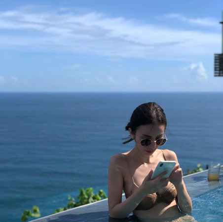 照片中,可以看到张宁儿随兴扎起长发、戴上墨镜,身穿咖啡色比基尼,相当映衬她的雪白肌肤,滑手机的双手正好挡在胸前,隐约露出东西半球,下半身浸泡在泳池里,水面透出纤细蛮腰,好身材一览无遗。